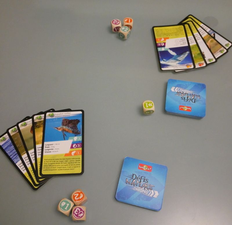 Il faut être le plus rapide pour l'emporter et mener vos animaux à la victoire. Attention, il va falloir tenir le rythme de "Défis Nature Chrono" et gagner sur tous les fronts avec les dès force, vitesse et camouflage mais aussi les cartes....